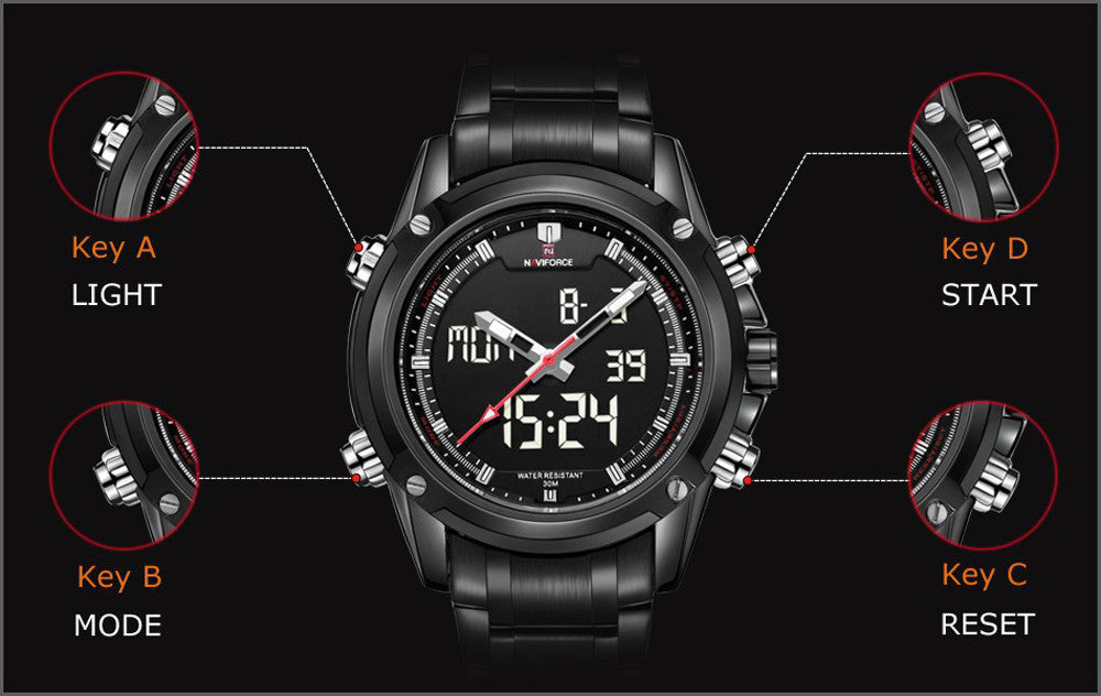Feature: Alarm,Water Resistant,Shock Resistant,Stop Watch,Complete Calendar,Multiple Time Zone,Chronograph,Auto Date,LED display